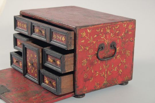 A VERY FINE 17TH/18TH CENTURY MUGHAL INDIAN LACQUERED WOODEN TABLE CABINET, comprising eight drawers, painted with gilt floral decoration and musicians, 29cm wide, 19cm high, 20cm deep.