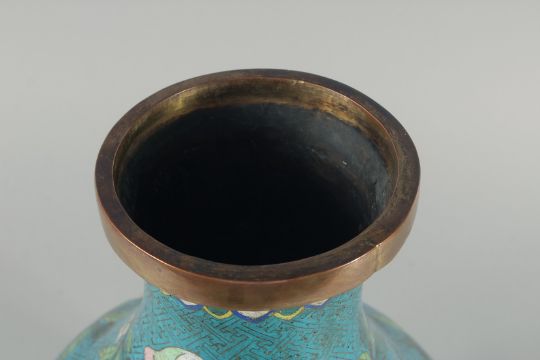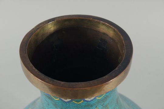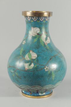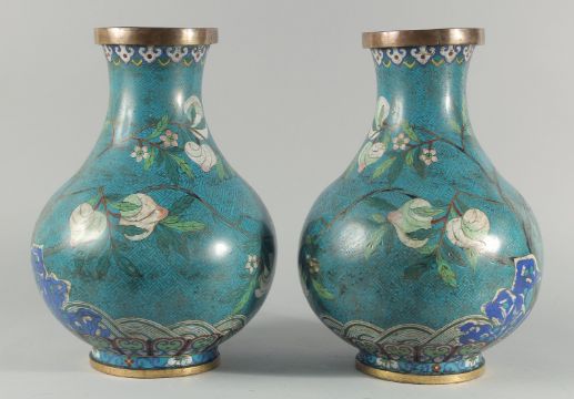 A FINE PAIR OF LARGE CHINESE BLUE GROUND CLOISONNE VASES, decorated with peach blossom above a band of waves, 41cm high.