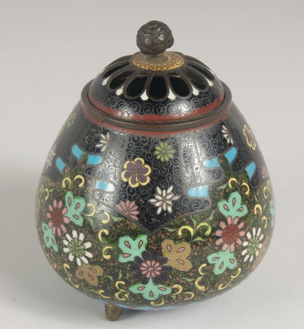 A JAPANESE CLOISONNE KORO, with openwork lid and floral finial, decorated with colourful flower head motifs and raised on three feet, 11.5cm high