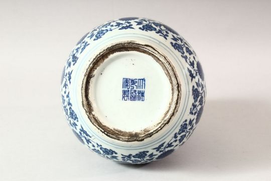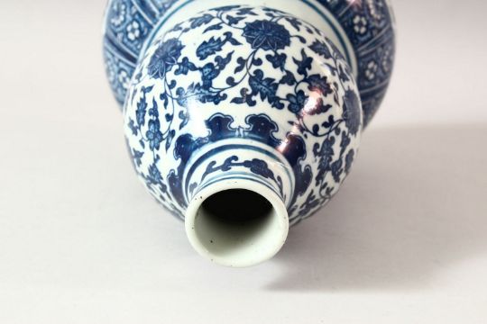 A CHINESE BLUE AND WHITE DOUBLE GOURD VASE, painted with lotus flowers, 27cm high.