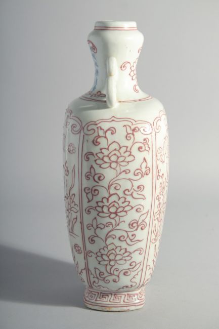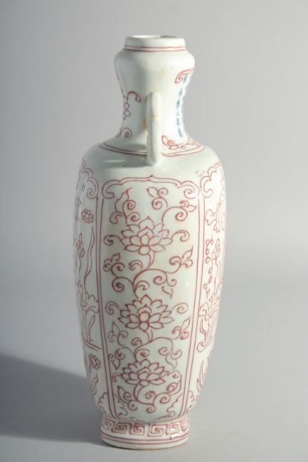 A CHINESE UNDERGLAZE RED TWIN HANDLE FLASK VASE, decorated with fish and aquatic flora, inscribed to the neck, 33.5cm high.