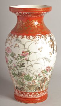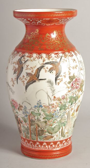 A LARGE JAPANESE KUTANI PORCELAIN VASE, the body painted with birds and native flora, further decorated with gilt highlights, the base with character mark, 36.5cm high.