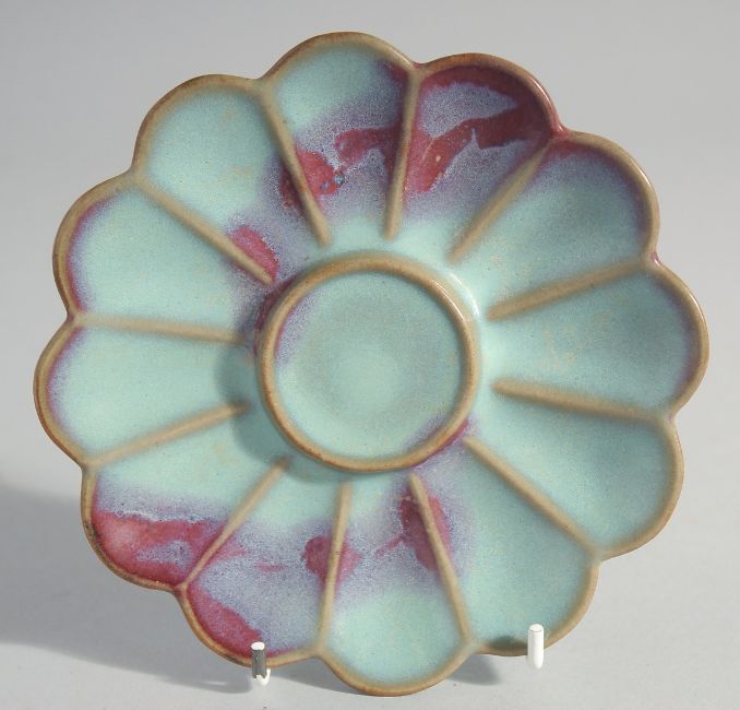 A CHINESE JUN WARE PETAL FORM CUP AND STAND, cup diameter 7.5cm, stand 14.5cm diameter.