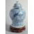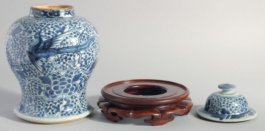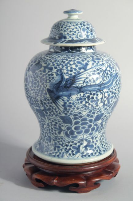 A PAIR OF CHINESE BLUE AND WHITE PORCELAIN JARS AND COVERS on hardwood stands, Kangxi period, each painted with phoenix and peonies, including original invoice from Wing Kei Crios & Porcelain, Hong Kong, overall height on stand 36cm.