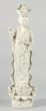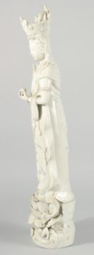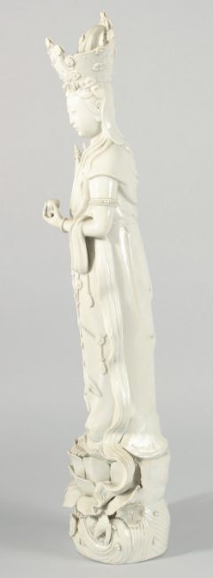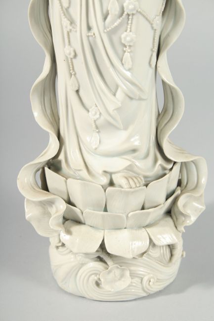 A GOOD LARGE BLANC-DE-CHINE FIGURE OF GUANYIN, stood upon a lotus base, 55cm high.