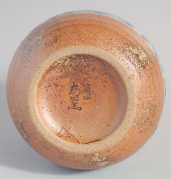 A SMALL JAPANESE POTTERY BOTTLE, with glazed decorative blue and white band, signed to base, 12cm high.
