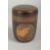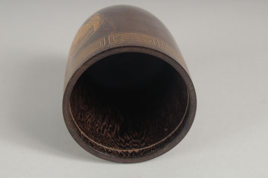 A FINE JAPANESE TURNED WOOD NATSUME / TEA CADDY, with a band of gilded key decoration to the lid and central signature, the caddy with another band of key decoration and two decorative gold and red lacquer cockerels, 10.5cm high.