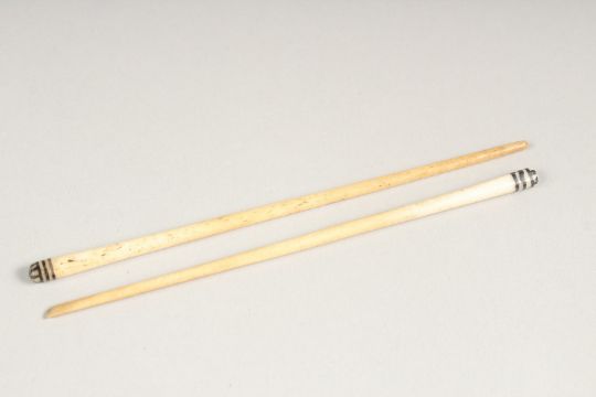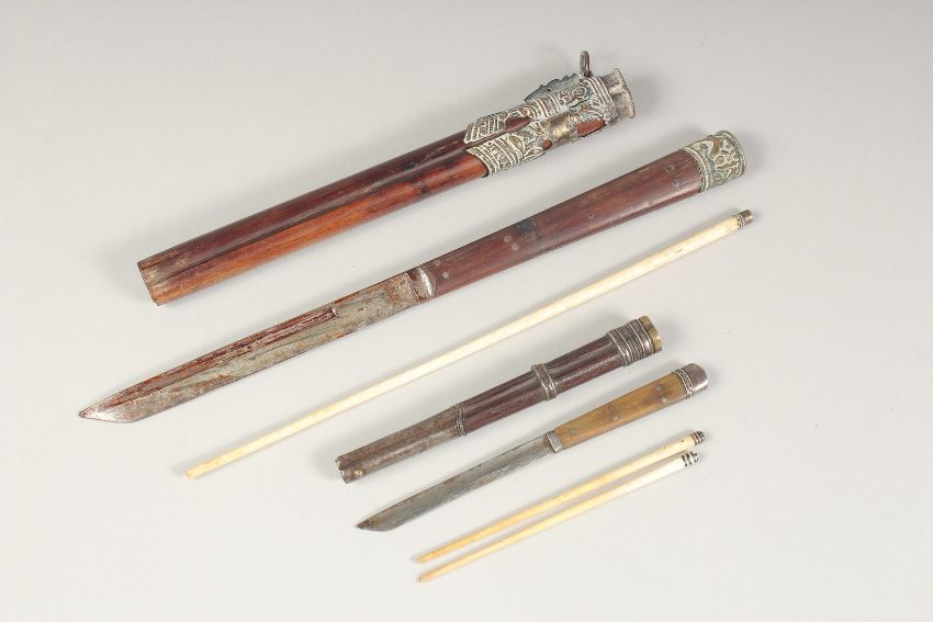 TWO TRAVELLING TROUSSE KNIFE AND CHOPSTICK SETS, each with bone chopsticks; the larger set lacking one chopstick, 32cm and 18.5cm, (2).