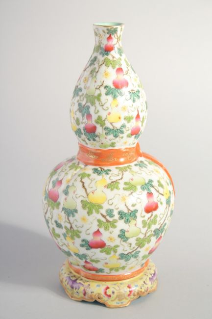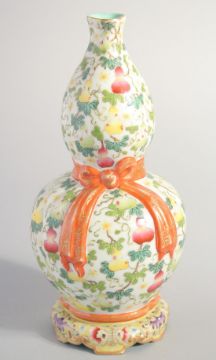 A CHINESE FAMILLE ROSE PORCELAIN DOUBLE GOURD VASE, decorated with gourds and moulded ribbon to the central section, the base with six-character mark, 25cm high.