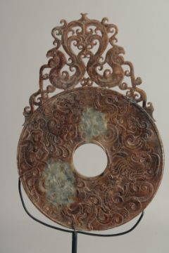 A CHINESE HARDSTONE DISK, raised on stand, the disk with relief decoration depicting various beasts, disk 33cm x 22.5cm.