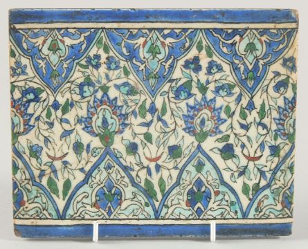 A 18TH/19TH CENTURY IZNIK GLAZED POTTERY TILE, decorated with foliate motifs in blue, turquoise and red, 16cm x 20cm.