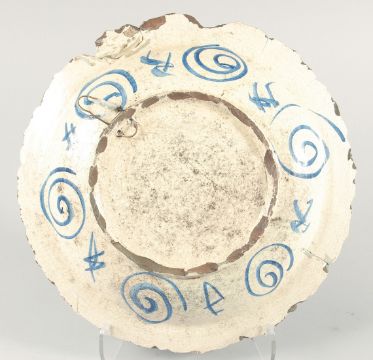A RARE LARGE EARLY IZNIK STYLE DAMASCUS POTTERY DISH, possibly 16th/17th century, painted with foliate motifs, (af), 33.5cm diameter.