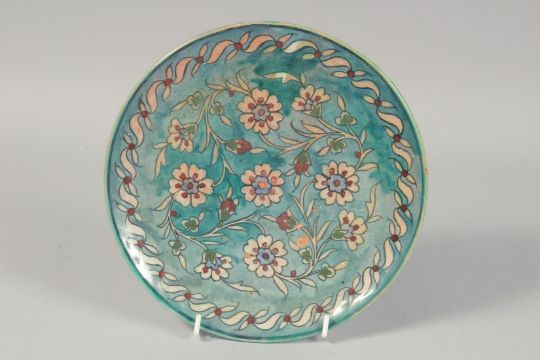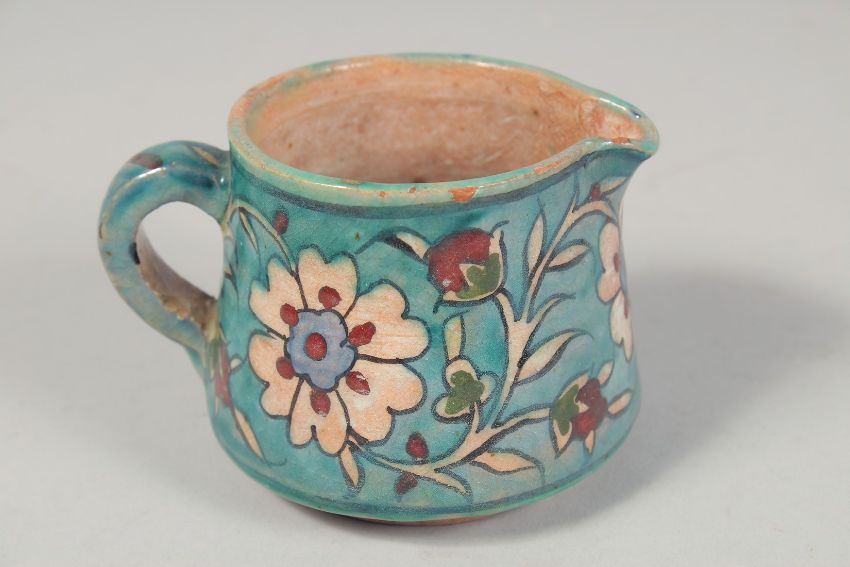 A PALESTINIAN TURQUOISE GLAZE POTTERY PART TEA SET, each piece painted with floral decoration, comprising of one lidded teapot, a teacup, a milk jug, six saucers and one dish, (10 pieces and lid).