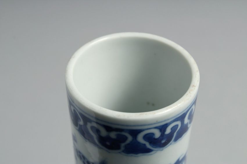 A CHINESE BLUE AND WHITE PORCELAIN BOTTLE VASE, painted with dragons and the flaming pearl of wisdom, the base with six-character mark, 22.5cm high.