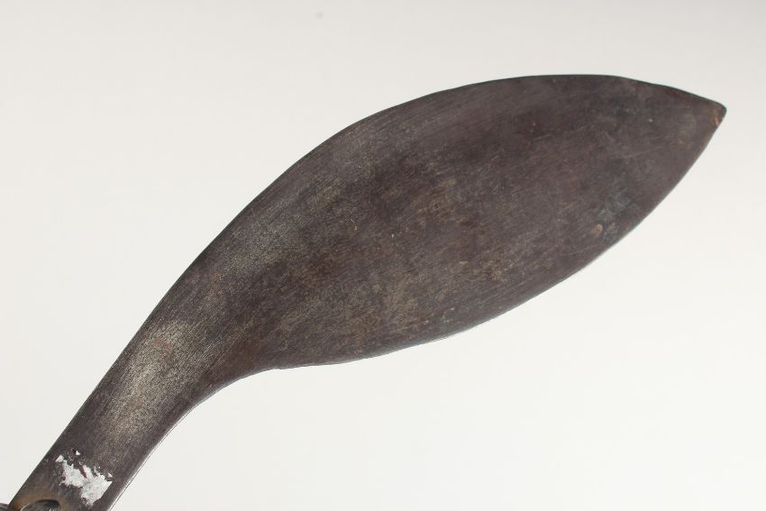 A 19TH CENTURY INDIAN KUKRI BROAD-BLADED KNIFE, with chased handle, 47cm long.
