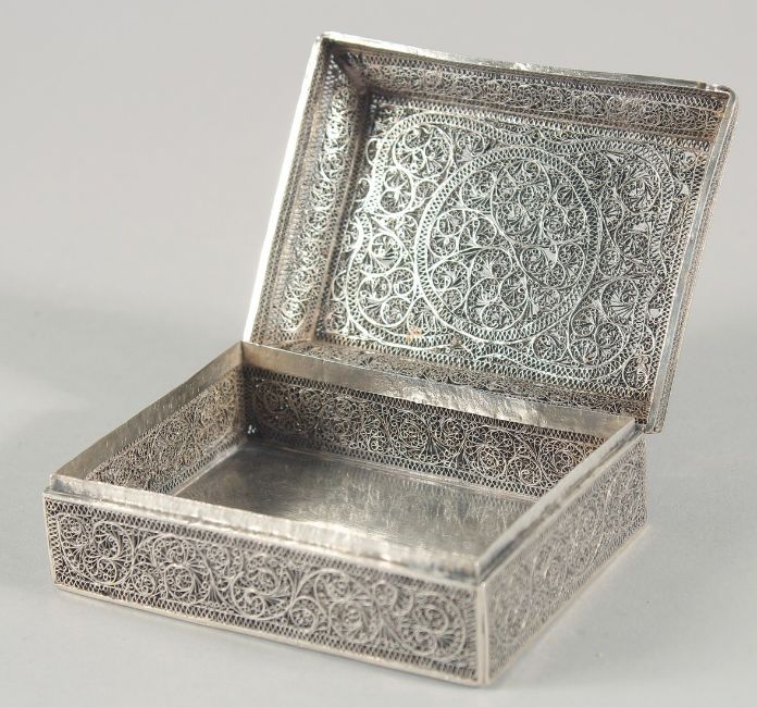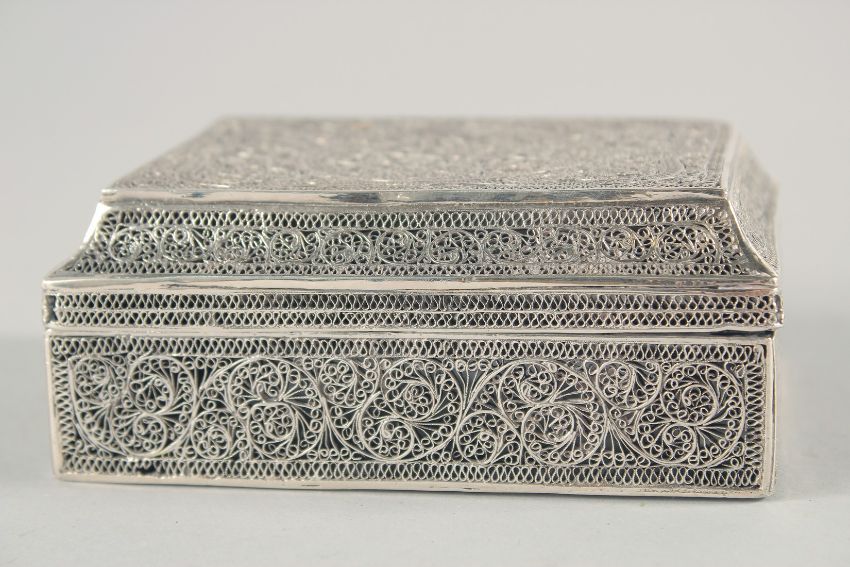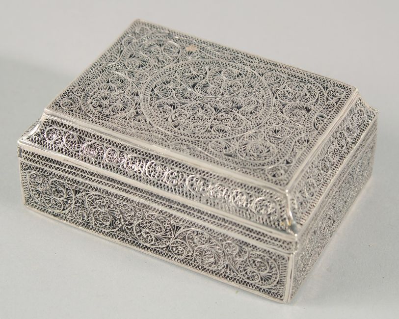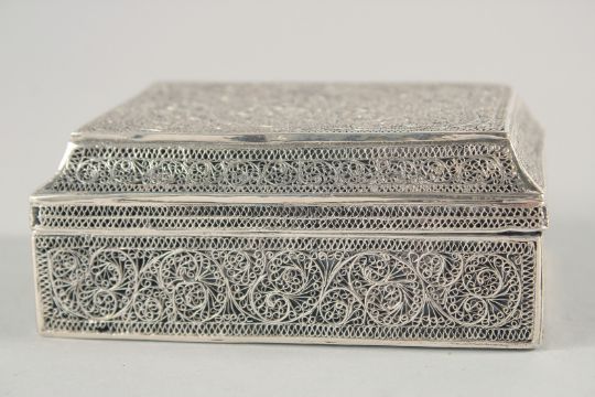 A FINE 19TH CENTURY INDIAN KARIMNAGAR FILIGREE BOX, 10.5cm x 8cm.
