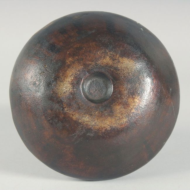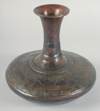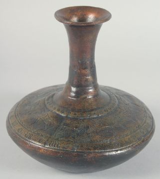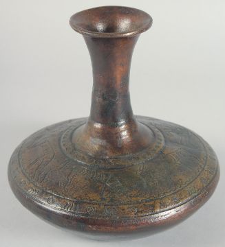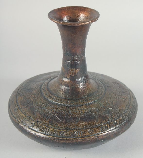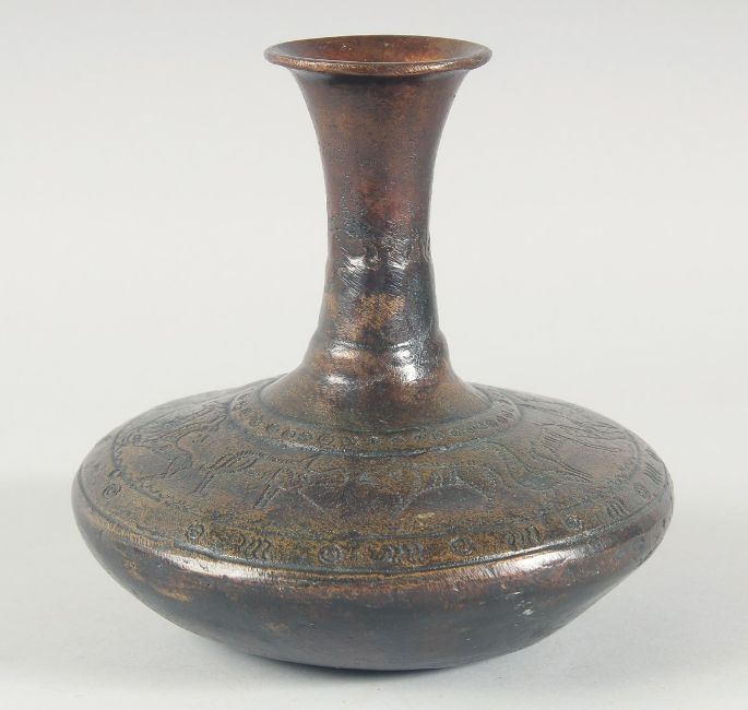 AN EARLY BRONZE CIRCULAR VASE, with chased decoration of a band of various animals, 21cm high.