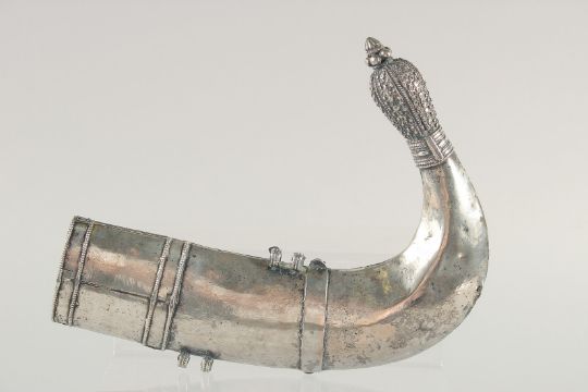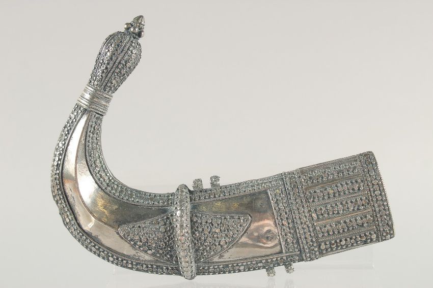 A FINE LARGE 19TH CENTURY RHINO HORN HILTED ARAB YEMENITE SILVER JAMBIYA DAGGER, 34.5cm in sheath.