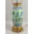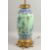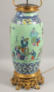 A VERY LARGE CHINESE GREEN GROUND FAMILLE ROSE PORCELAIN VASE / LAMP with ormolu mounted base, painted with a variety of figures performing different pursuits and further decorated with bands of floral motifs, 106cm high overall.