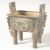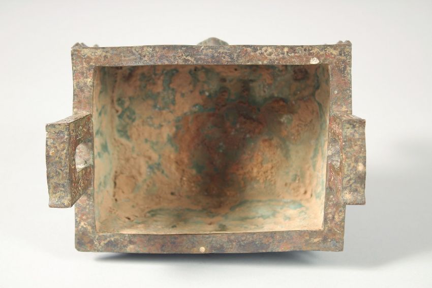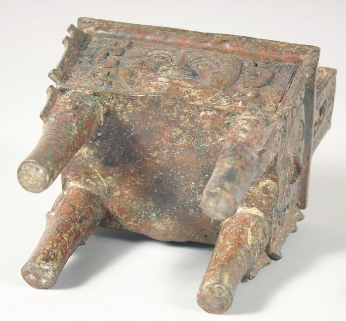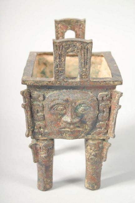 AN UNUSUAL ARCHAIC BRONZE TWIN HANDLE CENSER, the rectangular form censer decorated with relief face to each side and raised on four tall legs, 20cm high, 16.5cm wide.