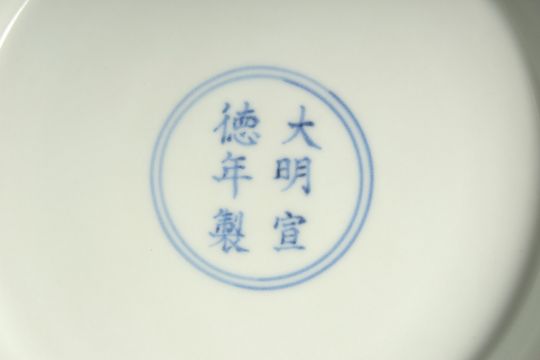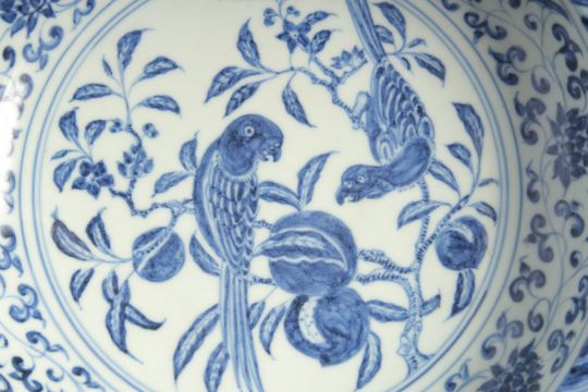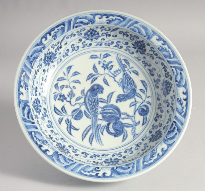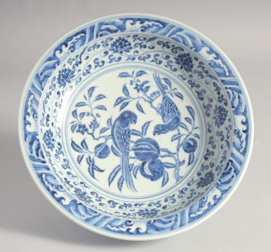 A CHINESE BLUE AND WHITE PORCELAIN PEDESTAL BOWL, the interior centre painted with parrots on a branch, six-character mark to base, 26.5cm diameter.