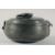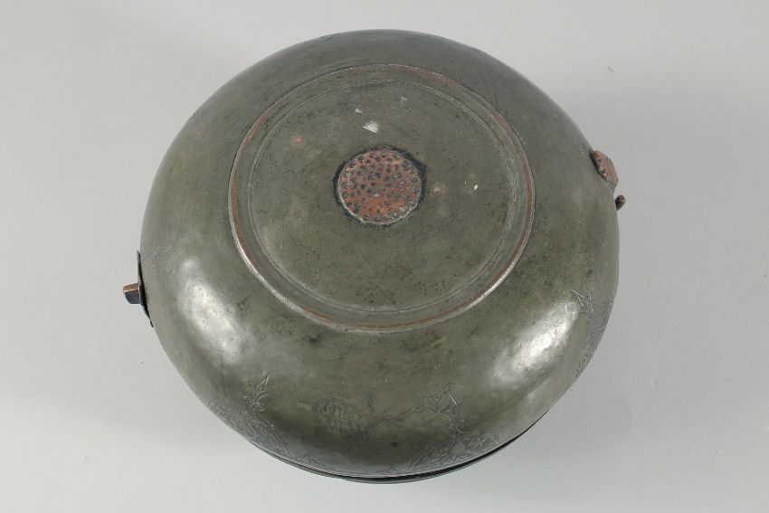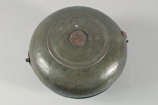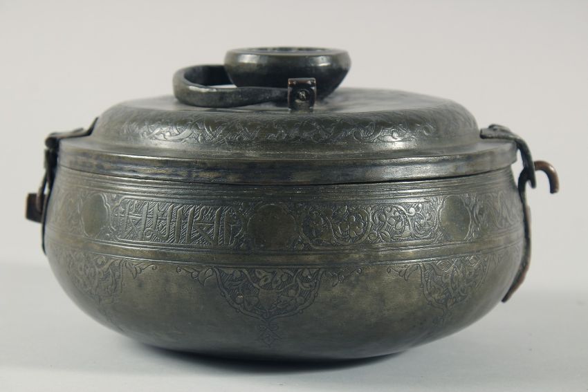 A 16TH/17TH CENTURY OTTOMAN TURKISH TINNED COPPER LIDDED BOWL, with swing handle and hooked latch, decorated with an engraved band of calligraphy and foliate motifs, 23.5cm diameter.