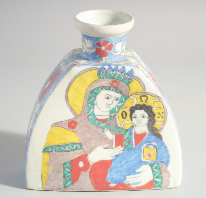 AN ARMENIAN GLAZED POTTERY WATER FLASK BOTTLE, painted with religious subject, 16.5cm high.