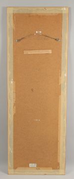 A FRAMED CHINESE SCROLL PAINTING ON PAPER, depicting a mountainous landscape, with red seal mark lower left, framed and glazed, image 87cm x 29cm.