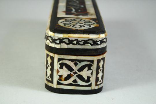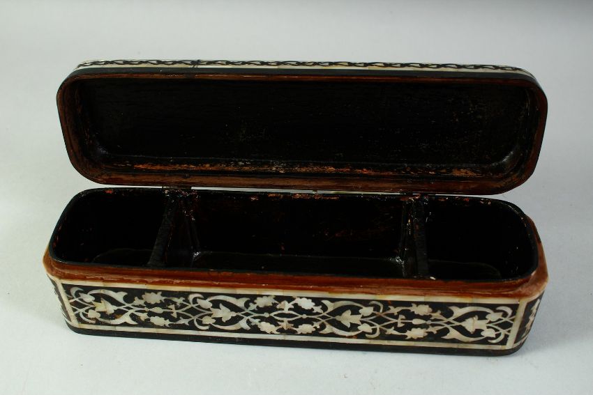 A TORTOISESHELL AND MOTHER OF PEARL INLAID PEN BOX, the lid with inlaid mother of pearl calligraphy, 28cm long.