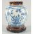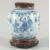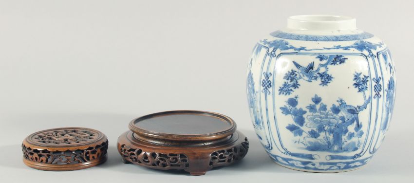 A CHINESE BLUE AND WHITE PORCELAIN JAR, with a carved and pierced cover and stand, the jar painted with panels of figures, birds and flora, four-character mark to base, jar measuring 18.5cm high.