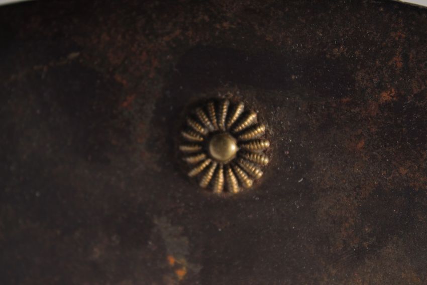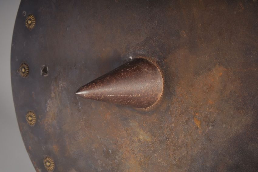 A 19TH CENTURY INDIAN SHIELD with large central spike, likely for a chariot wheel, 50.5cm diameter.