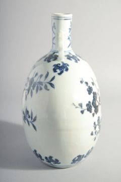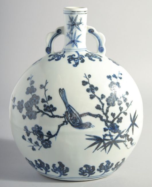 A CHINESE MING STYLE BLUE AND WHITE PORCELAIN MOON FLASK, each side paint with a bird on a branch, bearing a six-character mark, 27cm high.