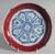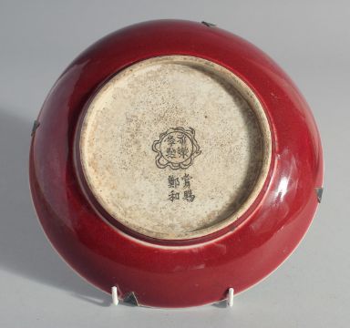 A CHINESE BLUE, WHITE AND COPPER RED DISH, decorated with radiating medallion to the centre, inscribed to base, 22cm diameter.