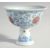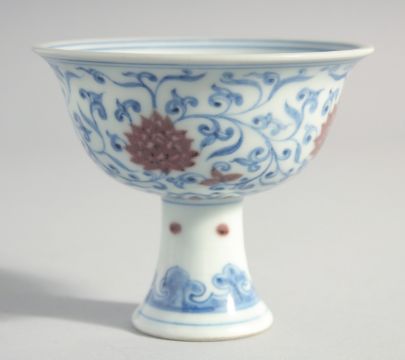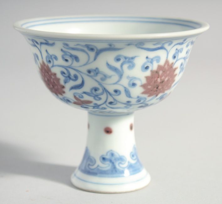 A CHINESE MING STYLE BLUE, WHITE AND UNDERGLAZE RED PEDESTAL CUP, the interior with four-character mark, 8.5cm high.