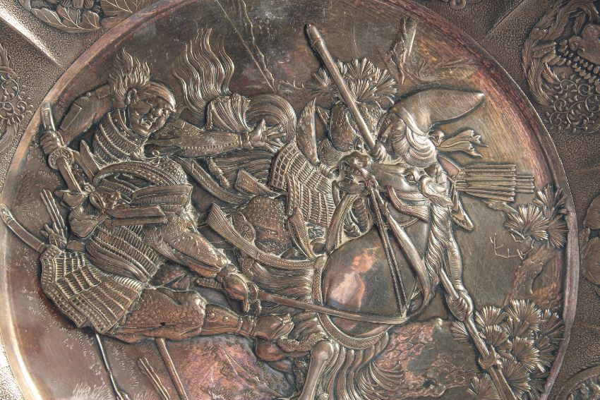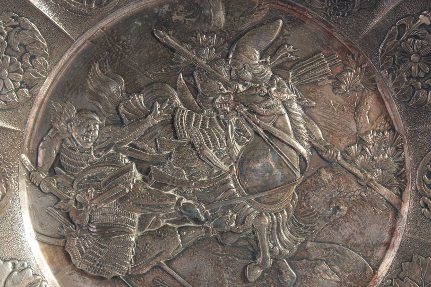 A PAIR OF JAPANESE EMBOSSED PETAL FORM WHITE METAL DISHES, each with central panel depicting battling warriors -one on horseback, with a border of motif roundels of dragons, phoenix and flora, 30.5cm diameter.