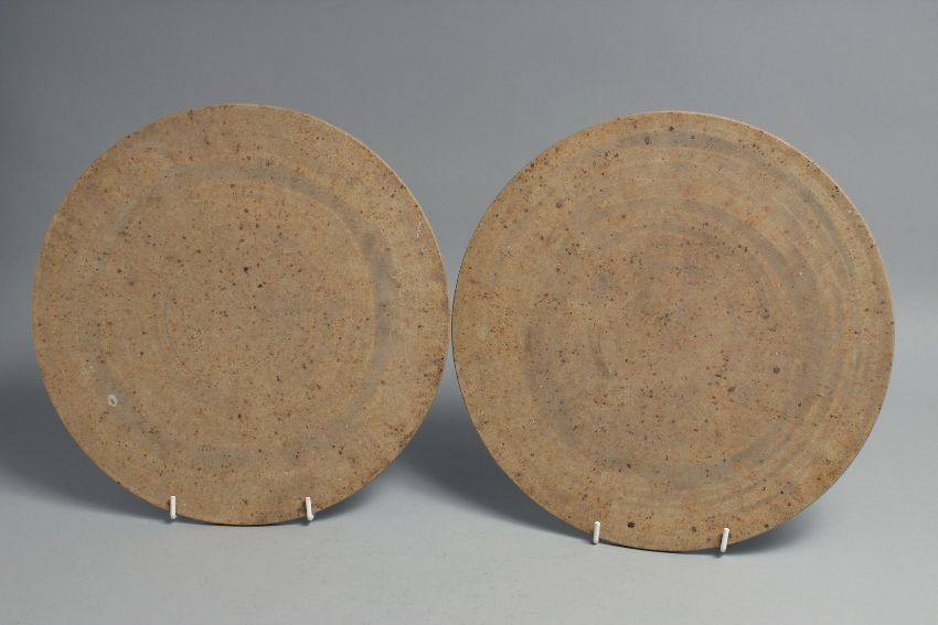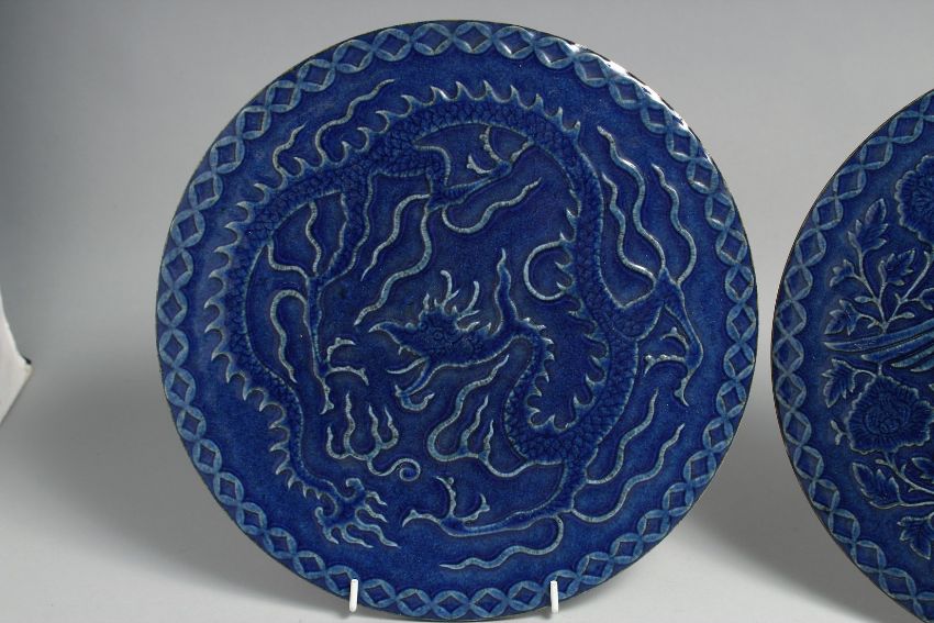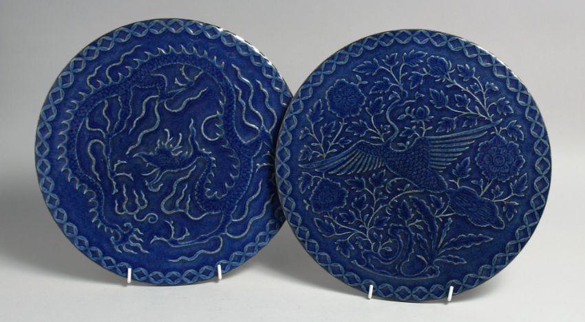 A PAIR OF CHINESE BLUE GLAZED CIRCULAR PLAQUES, one carved with a dragon, the other with an exotic bird, 28cm diameter.