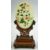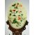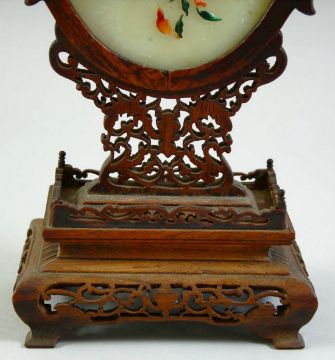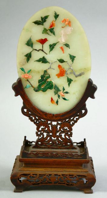 A CHINESE JADE AND HARD STONE OVAL TABLE SCREEN ON WOODEN STAND, the carved jade plaque onlaid with various stones depicting flora, supported on a carved and pierced wooden stand, overall 26cm high.