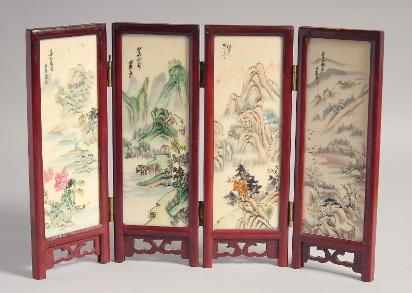 A CHINESE MINIATURE FOUR-PANELLED ALABASTER AND WOOD FOLDING SCREEN, painted on one side with mountainous landscape scenes, the reverse with flora and birds, each panel with inscription, 35cm long (fully opened).