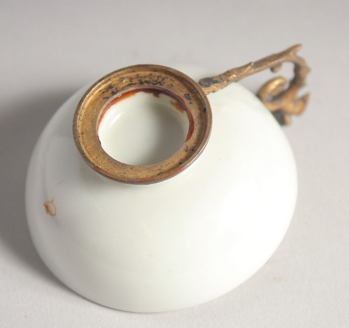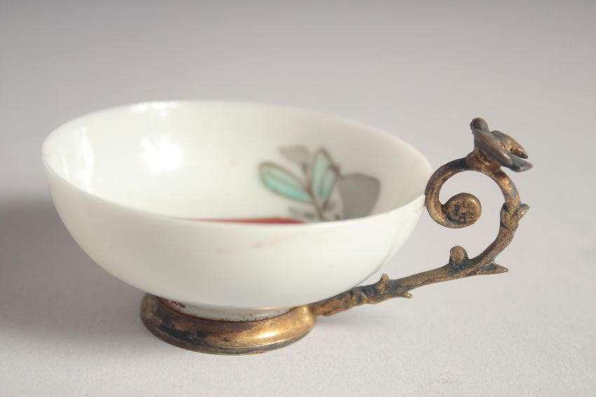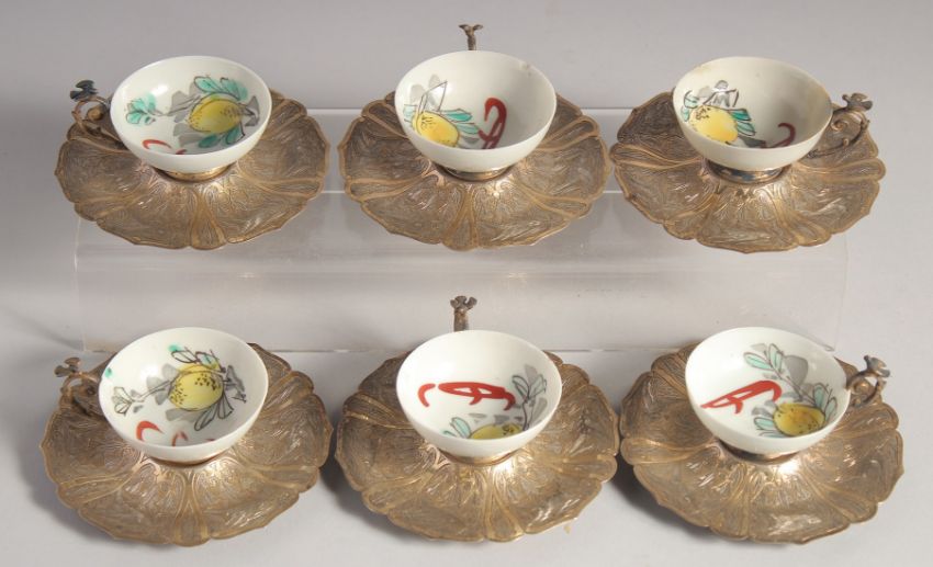 SIX CHINESE PORCELAIN CUPS WITH TURKISH OTTOMAN SILVER SAUCERS and mounted handles, porcelain cup 6cm diameter, silver saucer 11cm diameter, (12 pieces).