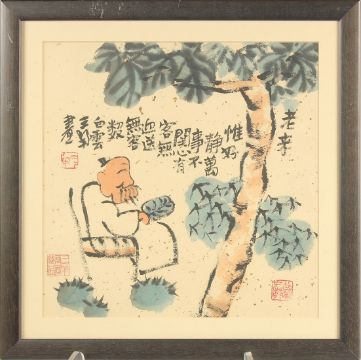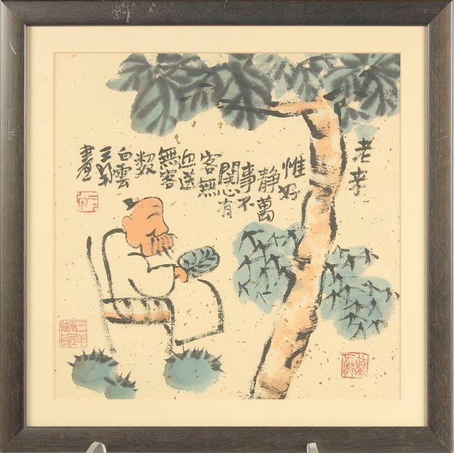 SANG YAN / ZHANG XIUZHEN: AN USUAL CHINESE PAINTING ON PAPER depicting two seated men inside a teapot with inscription and three red seal marks, framed and glazed, image 31cm square.