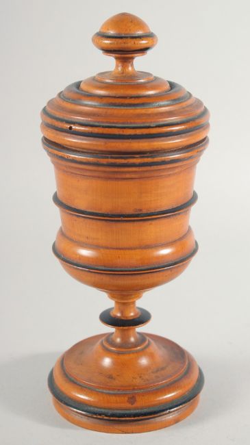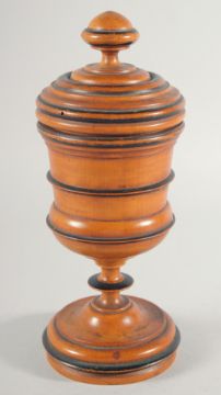 A TURNED WOOD CIRCULAR CHALICE AND COVER.