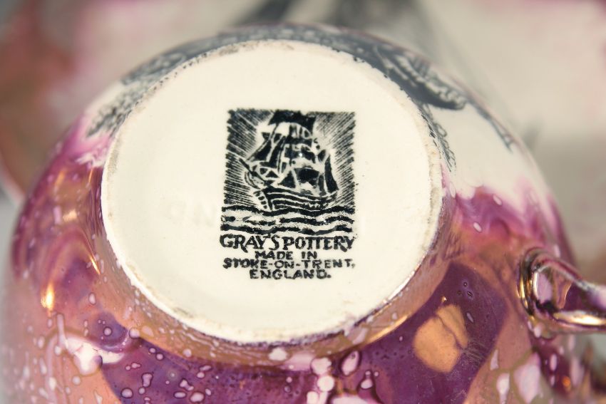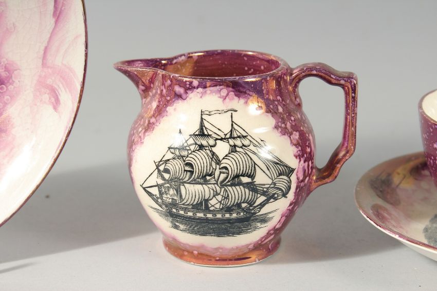 A SUNDERLAND PORCELAIN PINK LUSTRE CUP AND SAUCER "Flying Cloud" and a small cup and saucer and a jug. (5).