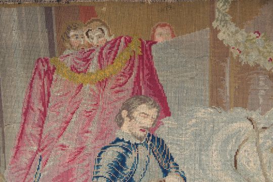 A GOOD 19TH CENTURY BRUSSELS NEEDLEWORK OF COUNTIES, FIGURES AND MAN ON A HORSE.