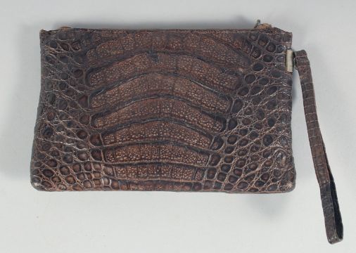 A 1940's - 1950's BROWN CROCODILE SKIN HANDBAG with raised skin, fitted interior with a purse.
