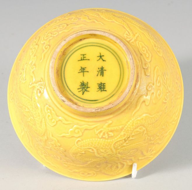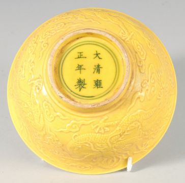 A CHINESE YELLOW PORCELAIN BOWL decorated with dragons.