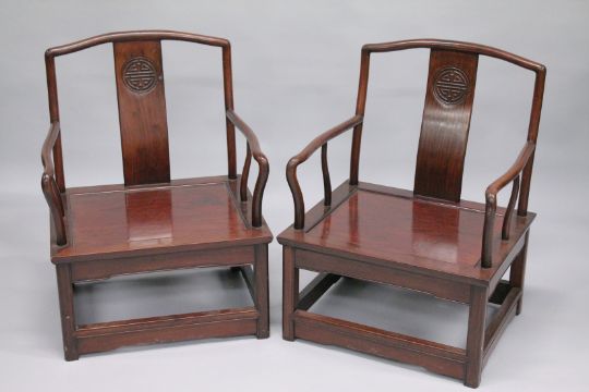 A PAIR OF CHINESE REDWOOD ARMCHAIRS.