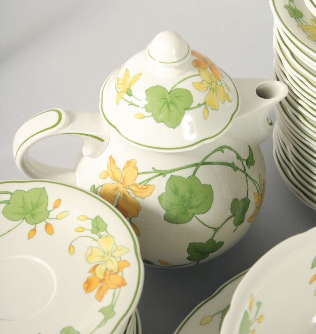 A LARGE VILLEROY & BOCH GERANIUM PORCELAIN DINNER SERVICE comprising thirty, 10 inch dinner plates, twenty eight, 8 inch side plates, twenty four, 6 inch side plates, eight large cups, six small cups, sixteen various salvers, four piece tea set, four salt and peppers, four bowls, two large bowls and stands, 8ins diameter, two small bowls and stands, 4ins diameter, two long oval bowls and stands, 14ins long.