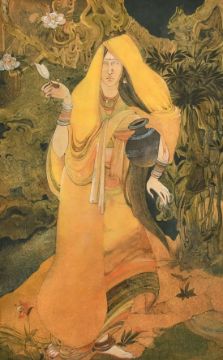 Bengal School, circa 1900, a female figure holding a water pot under her arm and with a flower in her other hand, ink and watercolour heightened with gold, 8.75" x 5.5" (22 x 14cm).