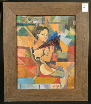 Naziha Selim (1927-2008) Iraq, a female figure with a geometric background, oil on canvas, 11.75" x 9.25" (30 x 23.5cm).