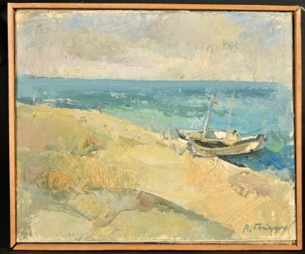 Russian School (first half 20th Century) Fishing boats tied up on a beach, oil on paper laid onto canvas, signed, 9.5" x 11.5", (24x29cm).